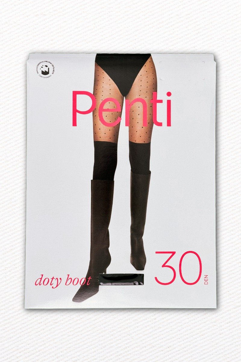 Make a statement with Penti’s Black Polka-Dot Boot Tights Denier 30, a fashion-forward fusion of playful dots and sleek boot illusion. These stylish tights feature a semi-sheer upper leg decorated with classic polka-dot patterns, contrasted by an opaque lower leg that mimics the look of trendy high boots.