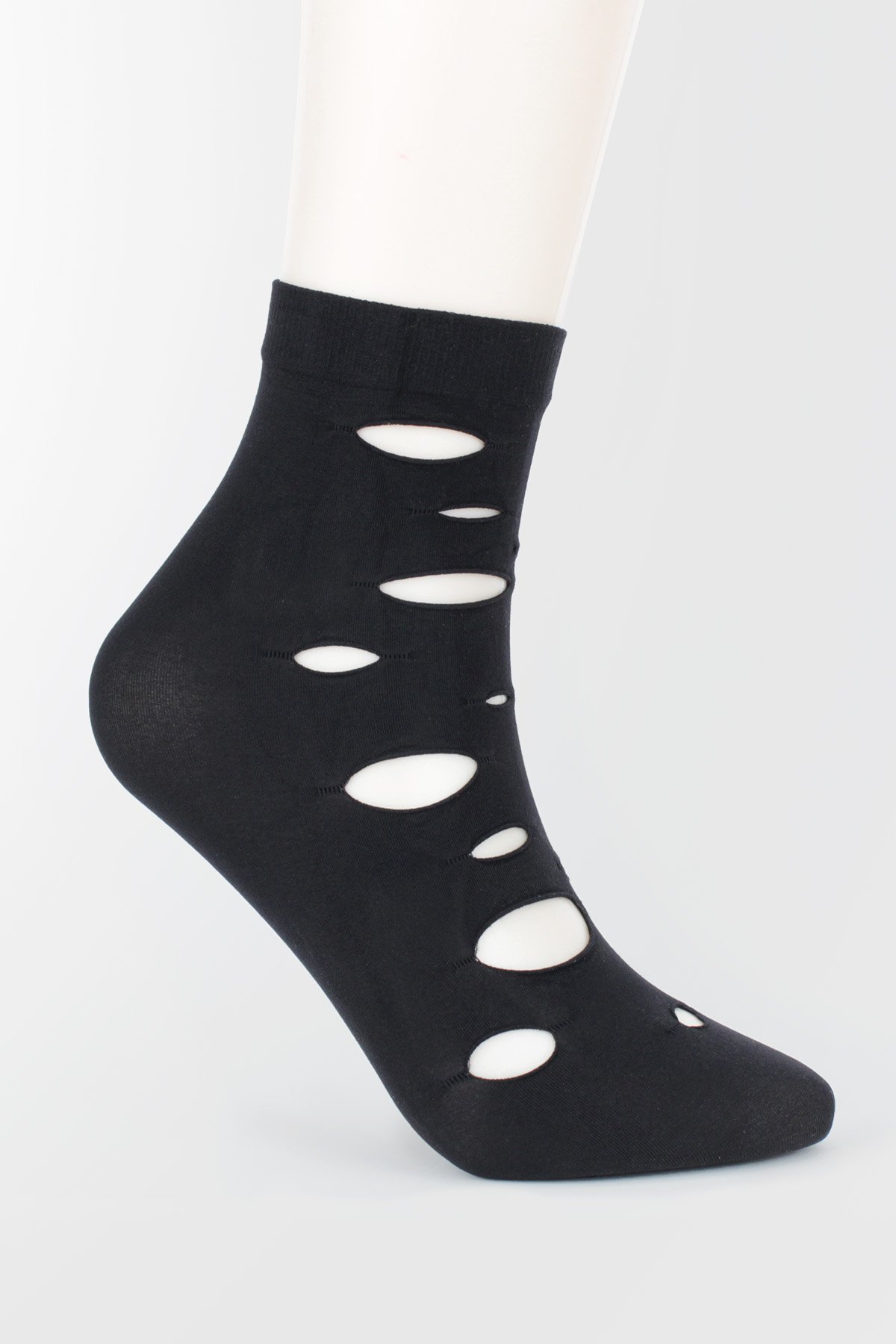 Add bold attitude to your look with these edgy torn-style ankle socks. Designed with a unique cut-out pattern, these black socks create a modern, fashion-forward statement. Made in Turkey from 85% polyamide, they offer a sleek, stretchy fit that’s both lightweight and breathable. Perfect for styling with sneakers, heels, or boots, these unisex socks bring a rebellious twist to your everyday wardrobe. Whether you’re dressing up for a night out or adding flair to your streetwear, these socks are the perfect finishing touch. Stand out with comfort, stretch, and an unmistakable ripped look that won’t go unnoticed.